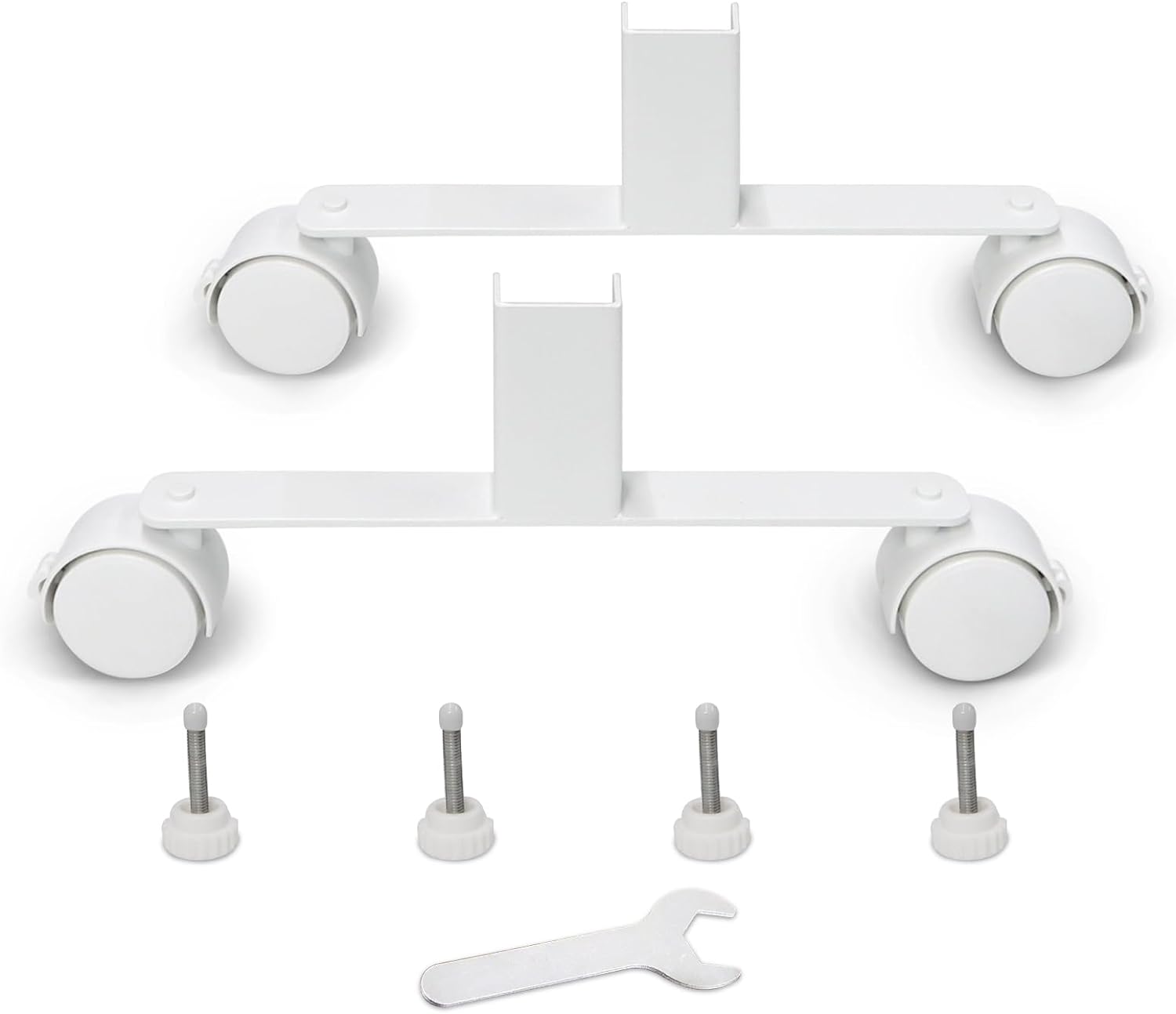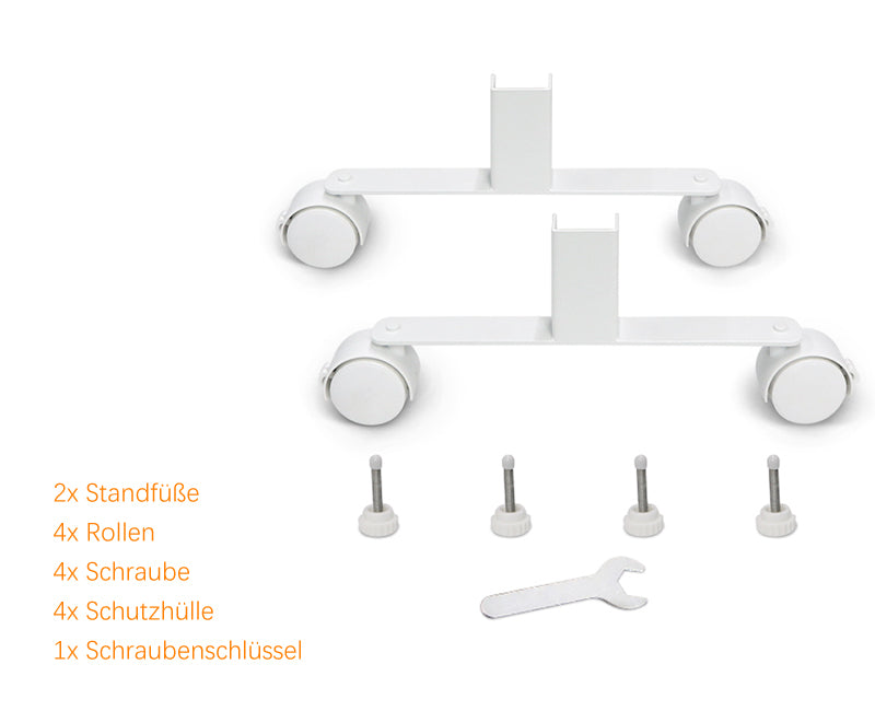 2x universelle Standfüße für Infrarotheizung, 4x Rollen, 4x Schraube, 4x Schutzhülle, 1x Schraubenschlüssel.